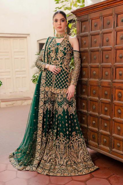 This chic masterpiece, designed in a captivating bottle green tint, seamlessly blends elegance and modernity. The composition features flared sharara pants and a tranquil off-sleeves jacket, creating a graceful silhouette. Sparkling ornamentation enhances the glorious green canvas, adding a touch of opulence. The ensemble is completed with a flamboyantly draped net dupatta, giving it an exceptional and refined look. Made to order in customized size with color customization options available for a perfect fit. Authenticity guaranteed with 100% original Kanwal Malik-MaheNur Luxury Formal design.
