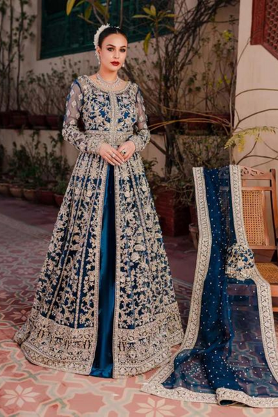 The exclusive teal organza open-cut pishwas is a versatile, head-turning piece that radiates elegance. It features a refined Indian heavy floral jaal, beautifully complemented by intricate adda work embellishments, elevating its beauty. This opulent pishwas is paired with a rich teal velvet lehenga and completed with a four-sided heavy organza dupatta, creating a captivating silhouette. Made on customized size, with color options available for a perfect fit and personalized style. Authenticity guaranteed with 100% original Kanwal Malik-MaheNur Luxury Formal design.