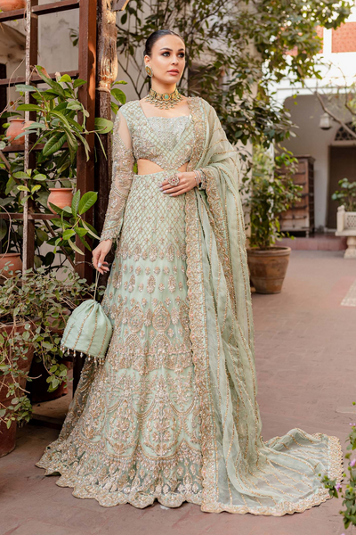 This mystic creation, with its thoughtful contemporary cut, forms a spectacular piece that offers a fully composed silhouette. Crafted in serene mint, this delicately designed ensemble features intricate hand embellishments, balanced beautifully with an organza dupatta. The modern cut ensures you radiate the ultimate bridal star feel, making this the perfect choice for any special occasion. Made to measure with customizable size and color options, it promises a flawless fit and personalized style. Authenticity guaranteed with 100% original Kanwal Malik-MaheNur Luxury Formal design.