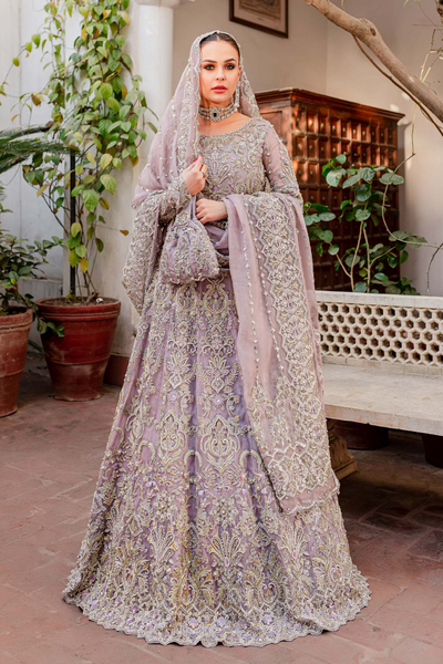 Mushq is an elegant lehnga choli that beautifully merges tradition with modern aesthetics, showcasing captivating hues of lilac and delicate motifs. The organza lehenga choli gleams with intricate embellishments, blending floral and geometrical patterns for a stunning visual impact. Heavily embroidered and hand-embellished with naqshi, dabka, crystals, pearls, and sequins, this opulent outfit is a true masterpiece. Paired with an organza dupatta, it features a four-sided embellished border and vertical embellished lines down the center, with an extended pallu. Customized sizing and color options ensure a perfect fit. Authenticity guaranteed with 100% original Kanwal Malik-MaheNur Luxury Formal design.
