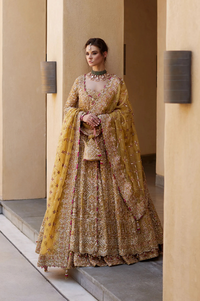 The Zarifa Anghrakha from Maysa Bridal Couture's '24 Collection is a stunning blend of bridal opulence and timeless elegance. Crafted from luxurious sheer yellow organza, it drapes beautifully, offering a regal, flowing silhouette. The intricate zardozi embroidery, with shimmering sequins, beads, and golden threadwork, is complemented by crystal and pearl accents for a luminous touch. The wrap-style front cinches the waist, creating a flattering shape, while the asymmetrical hemline and voluminous sleeves add modern sophistication. Paired with a richly embellished lehenga in Korean raw silk and a delicate organza dupatta, this bridal set promises an unforgettable, graceful statement.