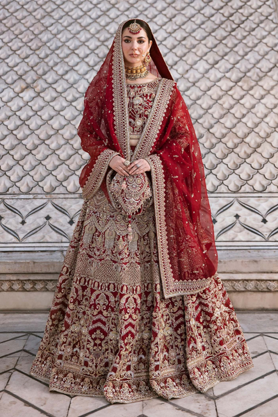 “Raania” from the Bridal Collection is an exquisite traditional ensemble, perfect for the Baraat occasion. Featuring a vibrant red organza lehenga with intricate motifs enhanced by sitara, dabka, and naqshi, it exudes timeless elegance. The fully hand-worked choli is adorned with elaborate motifs and gleaming details, adding to its charm. Paired with a heavily embellished organza dupatta featuring an all-around border and a center spray of motifs and pearls, this outfit is the epitome of grandeur. Customizable in size and color, “Raania” offers a perfect blend of tradition and opulence for your special day. Optional add-ons include a potli bag or a headscarf to complete the look.