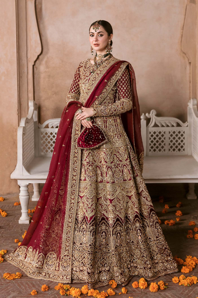 “Muntaha” from the Bridal Collection is an exquisite deep red ensemble crafted with luxurious Korean silk. The pishwas features a gorgeously hand-embellished bodice with an exaggerated flare adorned with naqshi, dabka, crystals, pearls, and sequins, exuding elegance and opulence. Paired with a heavily embellished Korean silk lehenga and an organza dupatta with a four-sided border, extended pallu, and spray, this outfit blends vintage grace with contemporary sophistication. Customizable for size and color, “Muntaha” is an ideal choice for grand celebrations, with optional add-ons such as a potli bag or headscarf to enhance the look further.