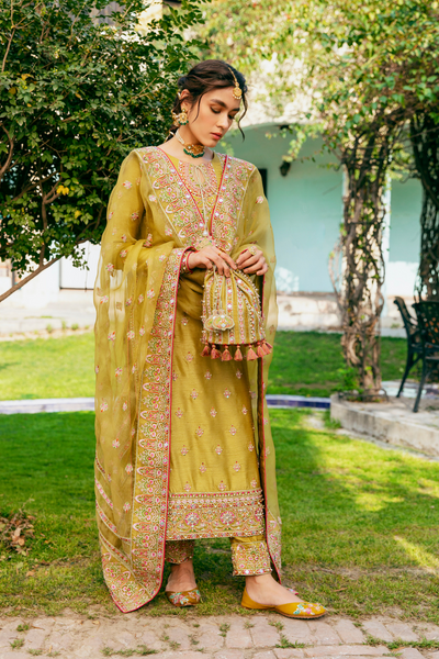 Designed in an enchanting shade of lime green, this outfit features a charming Korean silk shirt with a fully embroidered and embellished front and sleeves, adorned with intricate floral patterns. The shirt is beautifully finished with delicate tassels for added elegance. It is paired with an organza dupatta, featuring various pattis on the pallu and borders, completing the ethereal look. The ensemble is finished off with cigarette pants, accented with delicate floral borders and gleaming embellishments. Authenticity Guaranteed 100% Original.