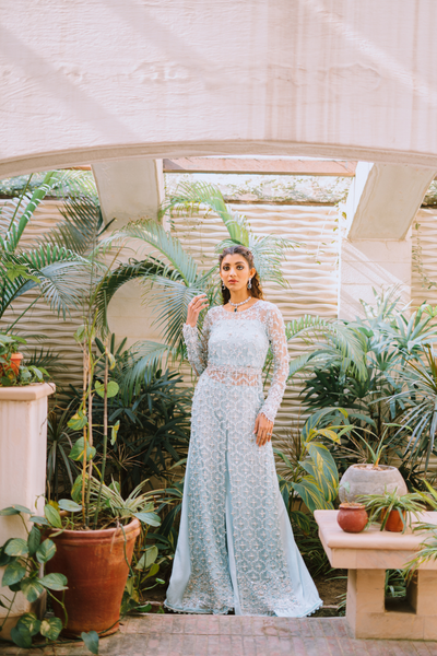 This gorgeous and delicate long shirt silhouette is artfully ornamented with pearls and crystals, on a powder blue organza canvas. This bold and lavishing outfit is paired with a detailed flared trouser along with intricate lace details.