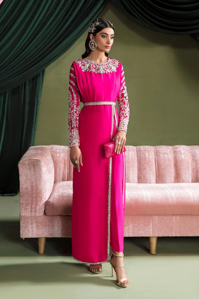 This bold and captivating shocking pink couture from Kanwal Malik Tesoro Luxury Pret'23 is the pinnacle of high-fashion elegance. Crafted from pure raw silk, the dress dazzles with Swarovski crystals and shimmering rhinestones, exuding opulence and glamour. Its one-sided open leg slit adds a sultry, contemporary twist, evoking intrigue and allure. Paired with sleek cigarette pants, the ensemble strikes a perfect balance between sophistication and drama. With options for size and color customization, this 100% authentic outfit ensures exceptional craftsmanship, making it a stunning choice for formal events or unforgettable nights out.