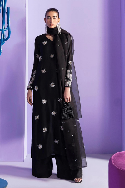 This breathtaking black ensemble from Kanwal Malik Tesoro Luxury Pret'23 embodies timeless sophistication and modern elegance. The tissue silk long shirt, adorned with exquisite crystal and sequin embellishments, captivates with its intricate detailing and sparkling allure. Its flattering silhouette elongates the body, offering a contemporary twist to classic design. Paired with dramatic flared pants in luxurious Korean silk and a PK raw silk slip for added comfort, the outfit is truly elevated by a lightweight Kathaan organza dupatta, which drapes effortlessly for an ethereal finish. Customizable in size and color, this masterpiece ensures authenticity and unparalleled craftsmanship.
