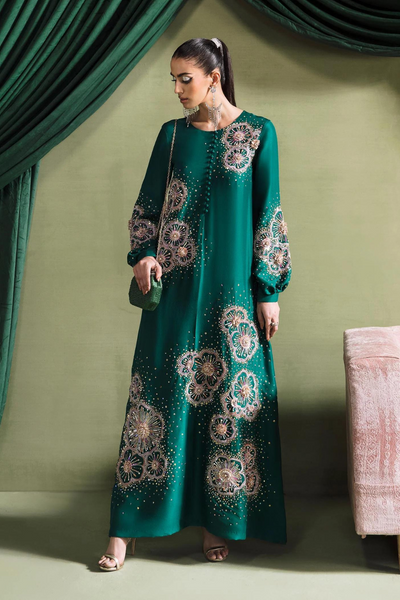 This masterpiece, Olivia, from Kanwal Malik Tesoro Luxury Pret'23, redefines elegance for any occasion. The dress is crafted from pure raw silk in a rich green shade, ensuring luxurious quality and sophistication. Hand-embellished with crystals and French sequins, it sparkles with intricate detail. Chunky floral patterns woven into the fabric create captivating texture and depth, while meticulously placed embellishments make it a one-of-a-kind design. Accompanied by sleek cigarette pants in the same fabric, this ensemble offers customization in both size and color, promising authenticity and exceptional craftsmanship for an unmatched look.