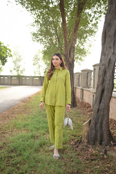Catch a vibe this summer in this cotton olive green co-ord set. Playful yet refined “Olivia” leaves an impact wherever it’s worn. Adorned with pearl button details it’s a perfect addition to your closet.