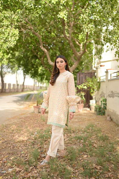 Lily On a charming beige canvas with pops of colour “Lily” is fun and stylish. This two-piece cotton set has statement ruffled sleeves and green lace around, giving it a fresh look for the summer. Paired with matching pants "Lily" is definitely a must have.