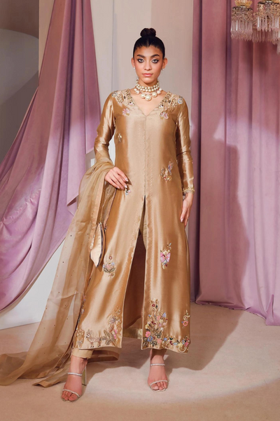 This spectacular light gold ensemble from MA Luxury Pret Forever & Ever exudes opulence and charm. The silk tissue shirt is intricately embellished with a stunning array of gold, blue, green, and orange bugle beads, gold and green sequins, and gold nakshi, creating a mesmerizing design. Paired with sleek PK raw silk pants, the outfit balances luxury with sophistication. The blingy organza dupatta, adorned with sequin chun, adds a touch of sparkle and elegance, making it a perfect choice for any special occasion. Authentic and meticulously crafted, this outfit guarantees timeless beauty and exceptional artistry.