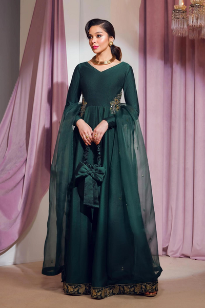 Gypsy, from MA Luxury Pret Forever & Ever, is a stunning emerald green traditional ensemble crafted from silk cotton net. The pishwaas features intricately embroidered side pocket motifs that add a unique and elegant touch. Accompanied by a graceful organza dupatta adorned with sitara work, it radiates timeless sophistication. Completing the outfit are PK raw silk straight pants that provide a balanced and polished finish. This authentic and meticulously designed ensemble is a perfect choice for a refined and elegant look on special occasions.