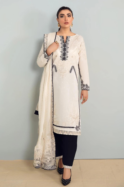 Exquisite embroidery crafted on cotton net paired with raw silk trousers and an fully embroidered chiffon dupatta makes for a true style statement. Color: Black Includes: 3 Piece Shirt, Trouser, Dupatta