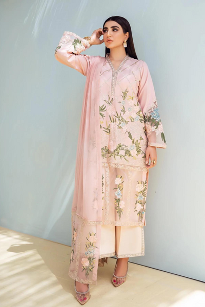 This elegant floral embroidered grip silk shirt is perfect for your fall afternoons. The look is completed with a stunning embroidered chiffon dupatta and raw silk trousers. Color: Peach Includes: 3 Piece Shirt, Trouser, Dupatta