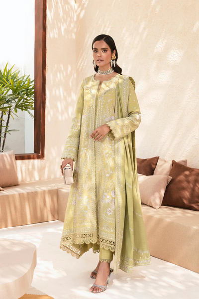 On the stunning shade of green, Fiorello is a stellar three piece crafted out of the cozy khaddar fabric. Flaunting away the ever delicate embroidey on the front-open shirt and shawl in the hints of lavender and white. Further glorified with the loop edges and scallop lace detailing on the borders and matching straight pants.