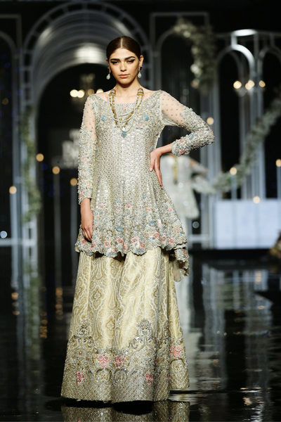 Dreamy ivory trail peplum with all hand made embellishment paired up with embellished brocade sharara and dupatta.