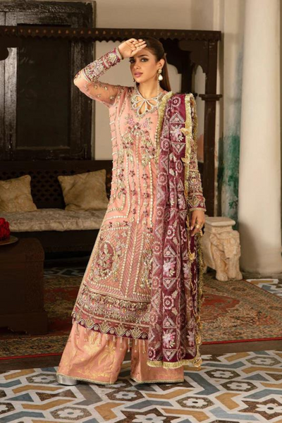 The "Gulaab'22" collection by Maryam Hussain features a laser-embroidered and hand-embellished front on net fabric, complemented by embroidered side panels and sleeves. The sleeves are further adorned with two delicate motifs on organza fabric. The embroidered back on net fabric and the embroidered borders on both the sleeves and front daman in organza enhance the elegance. The outfit is paired with a beautifully embroidered organza dupatta. It includes a dyed cotton silk inner and foil-printed raw silk trousers. Guaranteed 100% original.
