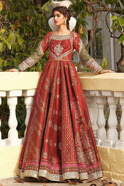 The Mohsin Naveed Ranjha Shaadi Collection'23 presents the Daneen Peshwas, a luxurious red garnet-hued ensemble made from premium Indian silk. The Peshwas is designed with a beautiful collage of blockprinted patterns that cover the expanse of the skirt, while the sleeves are highlighted with contrasting accents, adding to its eclectic charm. Intricate handworked embellishments adorn the garment, enhancing its opulent appeal. The outfit is complemented with a matching organza dupatta, featuring block-printed motifs and a delicate gotta trim, perfect for any festive occasion.