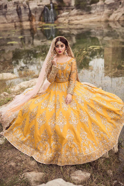 This elegant ensemble from MWK Bridal Collection features a raw silk lehenga exquisitely hand-embellished with nakshi dabka, gota, and beads, showcasing detailed craftsmanship. Paired with an organza shirt and a net dupatta adorned with floral and Mughal motifs, it exudes timeless grace. The design is further enhanced with delicate 3D net petals, adding depth and charm to the ensemble. Authentic and thoughtfully crafted, this attire is a perfect choice for regal occasions.