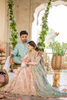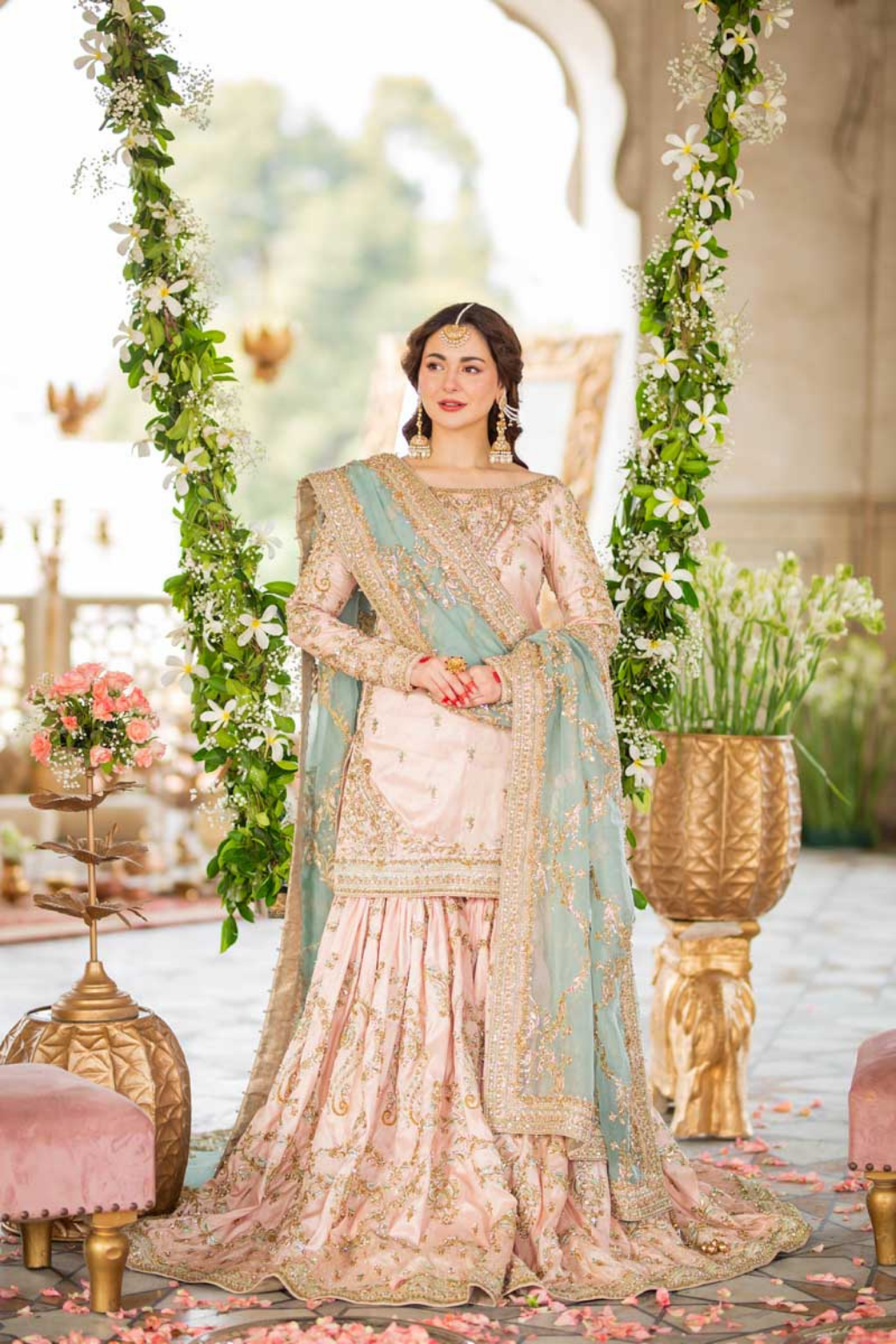 This pastel pink ensemble from MWK Bridal Collection exudes grace and charm. Featuring a raw silk knee-length shirt and sharara, it is beautifully adorned with intricate mixed medium hand embellishments, showcasing fine craftsmanship. Paired with a pure organza dupatta, the outfit achieves a harmonious blend of elegance and sophistication. Perfect for formal occasions, this authentic and meticulously designed attire captures timeless beauty in every detail.