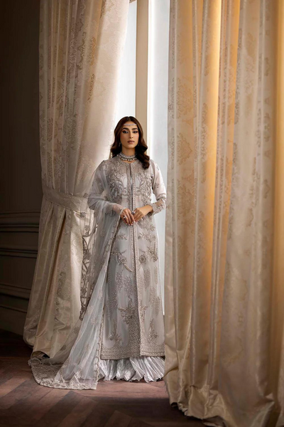 The Rozanne ensemble from Nuriya-Formal Rozanne'24 collection is a mesmerizing fusion of luxury and craftsmanship. The hand-embellished tissue fabric shirt is adorned with intricate crystals, nakshi, and dabka work, creating a dazzling and regal appearance. Paired with a crushed tissue lehenga, the look is further elevated by the delicate net dupatta, adding a graceful touch. 100% original and authenticity guaranteed, this ensemble is perfect for those who desire an elegant, timeless outfit that exudes sophistication and artistry.