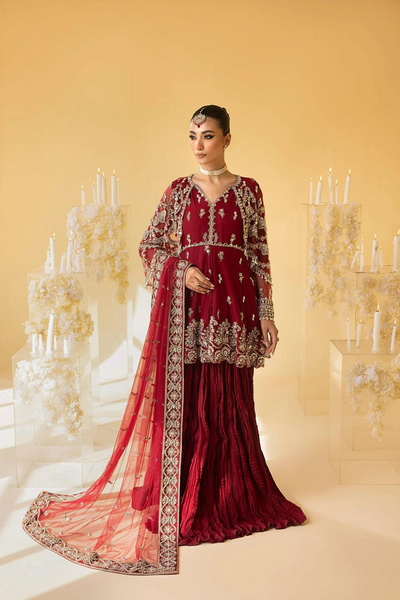 The "Scarlet" ensemble from Nuriya- Luxe Formal Mystic'24 collection epitomizes timeless elegance and modern charm. The barn red flared net and cotton silk peplum shirt is adorned with intricate floral motifs, scalloped borders, and embellished with mirror work, naqshi, dabka, pearls, and crystals, creating a mesmerizing flow. The design is further elevated with a stunning cape that adds unparalleled beauty and sophistication. Paired with a crushed sharara and a classy net dupatta featuring floral embroidered borders, this ensemble combines contemporary allure with classic design, ensuring a refined and celebratory appearance. 100% original and authenticity guaranteed.