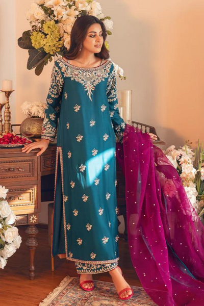 Diana by Pakistani Trousseau is a captivating ensemble that radiates festivity and charm. Designed in teal blue and magenta, the pure raw silk shirt and izaar are adorned with silver-toned hand embroidery, showcasing intricate artistry. Paired with a glamorous organza dupatta enhanced with a delicate sequin spray, this outfit is the perfect choice for intimate ceremonies. Authentic and exquisitely crafted, Diana embodies elegance and grace, making it a standout piece for special occasions.