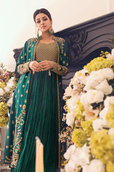 Royale by Pakistani Trousseau is a striking festive ensemble crafted from emerald green raw silk. The set features a sparkling jacket adorned with intricate 3D hand embroidery and metallic gold accents, adding a touch of opulence. Paired with a stupefying crushed gown, the geometrical checks on the bodice enhance its grandeur and modern charm. This authentic and meticulously designed attire is perfect for festive occasions, blending elegance with contemporary sophistication.