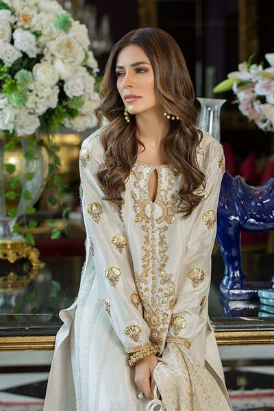 This captivating outfit from Reema Ahsan's Eid Edit'22 collection is a true style statement. The raw silk shirt features a unique embellishment technique and beautiful lace detailing, exuding elegance and charm. Paired with a block print organza dupatta and raw silk pants adorned with borders, this ensemble is perfect for festive occasions or formal gatherings. Its premium fabric and intricate craftsmanship make it a standout addition to your wardrobe, ensuring a graceful and sophisticated look.
