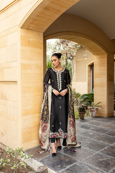 This refined raw silk embroidered panel shirt by Riffat & Sana is paired with a matching raw silk embroidered shawl, creating a beautifully coordinated ensemble. The luxurious raw silk pants complete the outfit, offering a perfect blend of comfort and style. The intricate embroidery on both the shirt and shawl showcases expert craftsmanship, while the soft, luxurious fabric ensures an elegant look. Crafted from 100% original, authentic fabric, this outfit is ideal for formal events, combining timeless sophistication with modern flair.