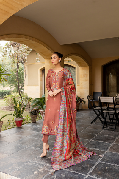 This elegant raw silk embroidered panel shirt by Riffat & Sana is paired with a matching raw silk embroidered shawl and raw silk pants, creating a stunning, cohesive ensemble. The intricate embroidery on the shirt and shawl adds a touch of artistry and sophistication, while the luxurious raw silk fabric enhances its timeless appeal. Perfect for formal events or festive occasions, this outfit embodies both elegance and refinement. Crafted from 100% original, authentic fabric, it promises unmatched quality and style for the discerning wearer.