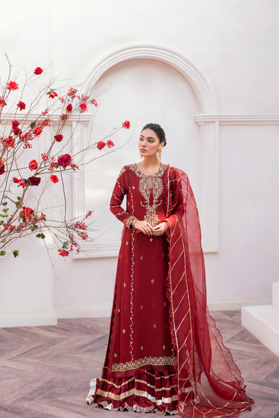 This stunning piece by RABIA ZAHUR effortlessly combines elegance with eye-catching glamour. Crafted from a beautifully rich shade of maroon silk, the shirt features intricate zarodi work, adding a layer of sophistication and craftsmanship. The flowing crushed long dress perfectly complements the luxurious fabric, while the delicate organza dupatta enhances the overall allure of the ensemble. Whether for a formal event or a festive occasion, this outfit ensures you radiate opulence and grace with every step.