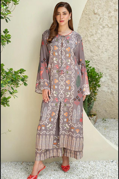 Step into understated elegance with this light grey crepe co-ord set from Sumaira Aurangzeb Fall Craze'24. Adorned with a carefully composed botanical print, the design is elevated by a vibrant pop of tangerine, adding a playful yet refined touch. Crafted from breathable crepe, the two-piece set includes a relaxed-fit shirt and coordinated trousers, offering both comfort and contemporary charm. Perfect for day-to-evening transitions, this ensemble is a timeless wardrobe essential that captures effortless sophistication
