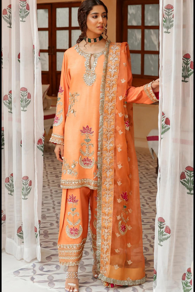 This stunning Narangi raw silk kameez from S.Auzeb Riwaayat Formal is exquisitely adorned with a tilla border and intricate embellishments, including resham, dabka, naqshi, and sitara work, adding an element of opulence. Paired with an embroidered shalwar and a luxurious organza dupatta featuring intricate aari embroidery, framed with delicate kiran for a refined touch. This three-piece set blends traditional craftsmanship with contemporary design, offering a perfect look for festive occasions. With its rich colors and exquisite details, it exudes elegance and timeless charm.