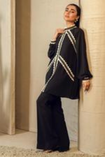 Black georgette lace embellished shirt. It can be paired with black boot cut pants.