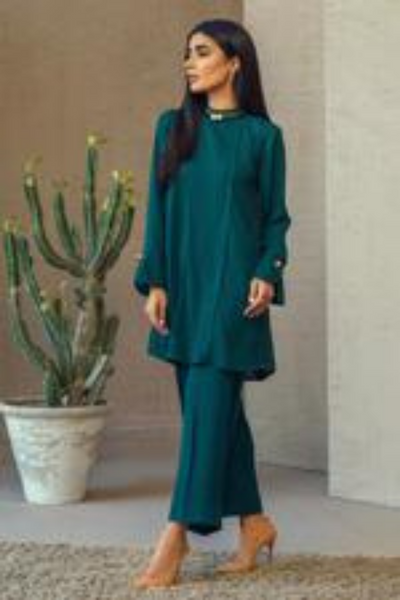 Deep bottle green georgette shirt, detailed with laces and embellishment on the collar and sleeves. It can be paired with same color culottes.