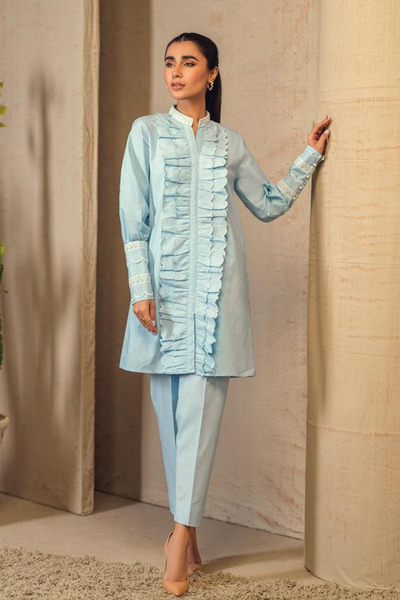 Heather blue cotton shirt with scalloped frill on the front and lace detailing on the sleeves. It can be paired with same color cotton pants.