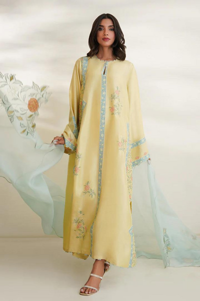 This exquisite ensemble from Sania Maskatiya Azur Eid-ul-Adha'24 collection features a pastel yellow tunic crafted from pure raw silk, delicately adorned with intricate floral embroidery for a touch of elegance. The tunic is paired with an elegant powder blue organza dupatta, showcasing scalloped edges and appliquéd accents that add an ethereal charm. Matching raw silk culottes complete the look, creating a cohesive and graceful silhouette. The combination of luxurious raw silk and delicate organza ensures a sophisticated and timeless appeal, making this ensemble perfect for festive celebrations. Authenticity guaranteed, 100% original.