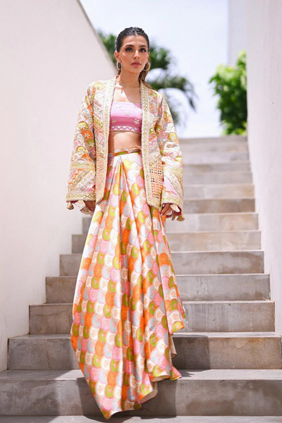The Kalisa ensemble from Sania Maskatiya Diwali Edit'24 embodies a vibrant blend of colors, including lime, powder blue, candy pink, tangerine, and celestial ivory, reflecting the festive spirit. The front-open, structured khaddi silk jacket is a masterful creation featuring eyelet and chatta patti techniques, intricate gota detailing, and playful tassels. The khaddi silk candy pink tube top is adorned with floral gota bunches, while the statement draped skirt, crafted from charmeuse, beautifully harmonizes the entire look. This piece is designed with a relaxed fit, and the model stands at 5'5". The length is 27 inches with a maximum length of 38 inches, and its authenticity is guaranteed as a 100% original creation.