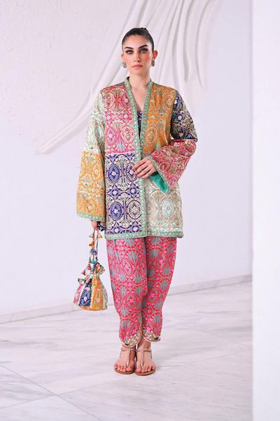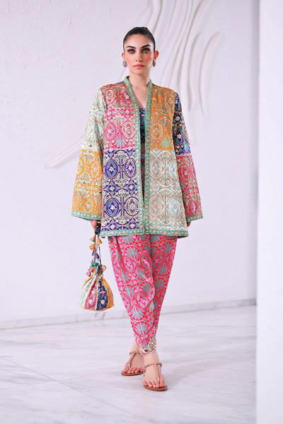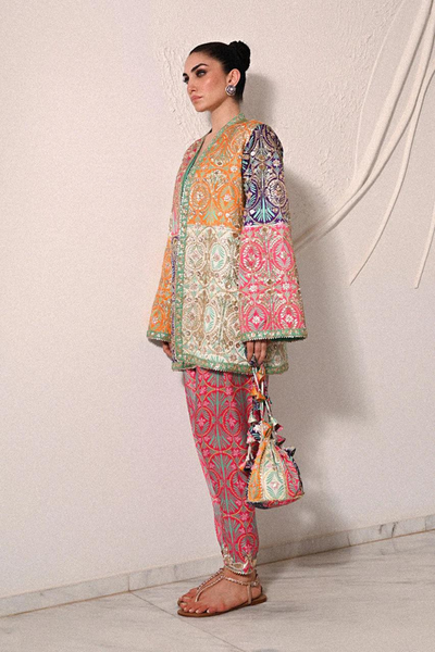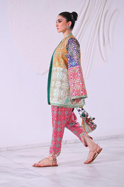 Leyah reinvents festive wear with a touch of effortless elegance in the Sania Maskatiya Diwali Edit'24. This color-blocked, relaxed-fit jacket boasts an assertive silhouette, enhanced by pops of vibrant tangerine, fuchsia, and indigo. The neutral ivory balances the bold tones, while an intricately embroidered mint border harmonizes the look. Crafted from soft charmeuse, the fluidity of the fabric contrasts beautifully with the jacket's structured form. Paired with a symmetrically printed fuchsia shalwar and a deep indigo tube top, this ensemble is a fusion of sophistication and playfulness. The model stands at 5'3", with a jacket length of 31 inches and a relaxed fit cut. Includes jacket, shalwar, pouch, and tube top, with authenticity guaranteed, ensuring this 100% original design is a statement of modern luxury.