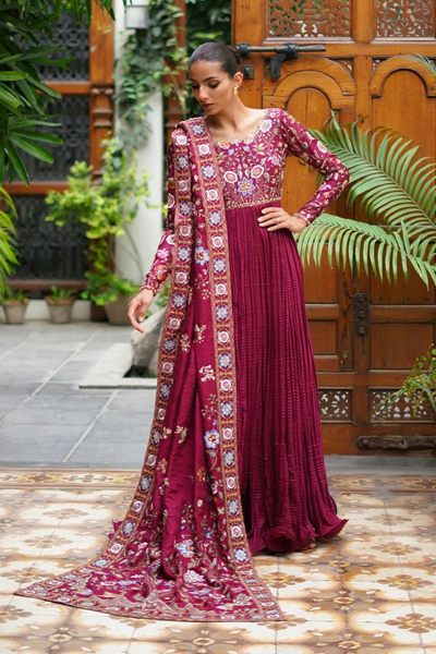 Embrace timeless elegance with this exquisite ensemble. The ruby red self jamawar shawl is beautifully adorned with hand embellishments and intricate resham embroidery along its border and pallu, adding a luxurious touch. The cascading peshwas, crafted from crushed khaddi silk in the deepest ruby red, pairs perfectly with the shawl. Its exquisitely embroidered bodice and long sleeves complete the refined, regal look.