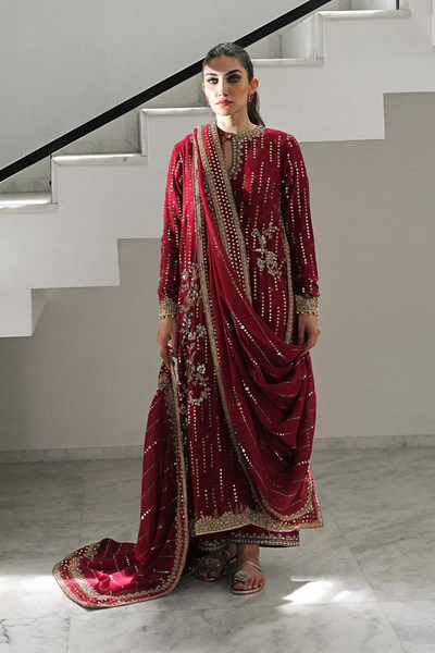 Elayna (A) reimagines classic festive wear with a contemporary touch. The emerald A-line cotton net shirt drapes effortlessly above the similarly hued pure rawsilk izaar and a crimson cotton net dupatta. Intricate kamdani embroidery, complemented by an assortment of tiny beads and metallic sequins, enhances the ensemble’s allure. Floral bunches in zardoze break the monotony, creating a refined and balanced look.