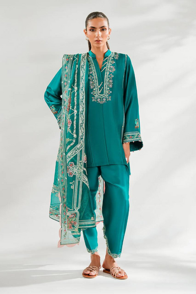 Ruba by Lana'24 from Sania Maskatiya is an effortlessly elegant ensemble, perfect for the season. This stunning outfit features a rich emerald green pure raw silk shirt and shalwar, paired with an intricately embroidered organza dupatta. The jewel-toned shirt and cascading dupatta are beautifully complemented by delicate embroidery, elevating the classic silhouette with sophisticated detail. Designed for comfort and style, this relaxed fit set offers a perfect balance of tradition and modern elegance.
