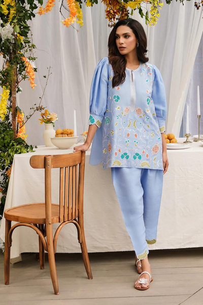 Embrace timeless elegance with this periwinkle pure raw silk shirt, adorned with mystical floral appliqué and resham embroidery. The statement sleeves and ivory resham tanka on the neckline elevate this piece into a true standout for any season. Paired with a pure raw silk shalwar, featuring an appliquéd hem, this ensemble maintains its understated elegance while offering a bold yet graceful aesthetic. Perfect for both casual and festive occasions, this relaxed-fit outfit combines modern craftsmanship with classic beauty, making it a versatile addition to any wardrobe.
