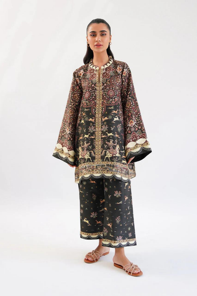 An earthy-hued botanical print graces the charcoal raw silk shirt and culottes, creating a harmonious balance between elegance and nature. The ivory cut-outs on the oversized sleeves and hem add a refined touch to this luxurious, yet effortlessly chic ensemble. Designed for a woman who embodies casual luxury, this outfit exudes sophistication with its relaxed fit and thoughtful details. The model, standing at 5'2", showcases the 33" length, with a maximum length of 36". Perfect for daytime events or evening outings, this piece offers versatility and modern charm.
