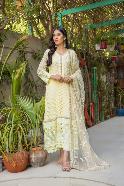 Radiating confidence and charm, this vibrant yellow ensemble is crafted from cutwork woven fabric, styled into a graceful long pishwas. The cutwork border is elevated with delicate pearl and sequin-embroidered lace, adding a refined sparkle. Paired with a beautifully embroidered net dupatta, adorned with intricate hand-embroidered borders on all sides, this look exudes festive elegance and timeless sophistication — perfect for the strong-spirited woman.