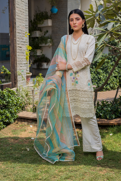 A timeless and elegant ensemble in pure off-white, this Sidra Mumtaz design features a schiffli fabric front with a pin-tucked cotton lawn back, beautifully hand-sprayed with pearls. Lace detailing on the daman and sleeve borders adds a soft, feminine charm. The look is perfectly complemented with a pastel-toned cotton organza khadi dupatta, bringing a hint of color contrast. Paired with matching cotton lawn pants, this outfit is ideal for graceful daytime wear, exuding classic sophistication and subtle luxury.
