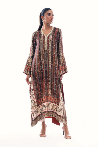 This intricately printed self jamawar kaftan features delicate gota detailing on the neckline and sleeves, elevating the garment with rich, traditional craftsmanship. The borders are adorned with floral and foliage imagery, adding a graceful touch. Paired with cream-colored rawsilk trousers, the ensemble offers a harmonious blend of elegance and comfort. With a shirt length of 51" and a model height of 5'7", this kaftan set is perfect for those seeking a sophisticated yet contemporary look.