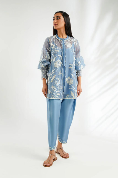 The powder blue organza jacket from Sania Maskatiya's Inaya Drop-II collection is an exquisite statement piece. Intricately embroidered with ivory 3D detailing along the neckline and cuffed sleeves, this jacket exudes elegance. It is paired perfectly with a matching pure rawsilk tapered shalwar adorned with pearl accents, alongside a chic crepe slip. This ensemble, designed in a relaxed fit and at a length of 29", offers endless styling possibilities for both formal and semi-formal occasions.