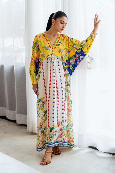 The Lemon and Ivory Colour Blocked Kaftan is a playful and vibrant piece, showcasing the brand's signature painterly print. With its flattering neckline cinched for an elegant silhouette, this crepe kaftan is perfect for any occasion. Whether dressed up for an evening out or styled casually for a day look, its relaxed fit and versatile design make it an enduring addition to your wardrobe. The 52" length and comfortable cut ensure a stylish, chic appearance that will remain a wardrobe staple.